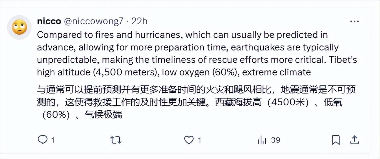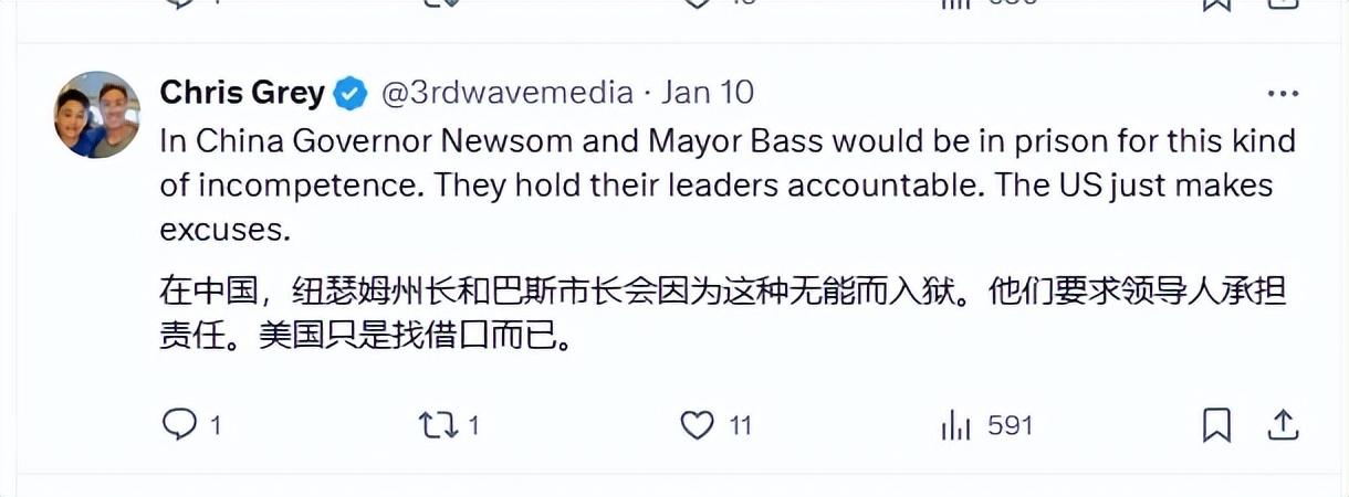還有人把西藏救援和洛杉磯火災做對比,有個網友說,在中國,洛杉磯市長和洛杉磯消防局長會因爲這種無能而入獄,美國只會找藉口。