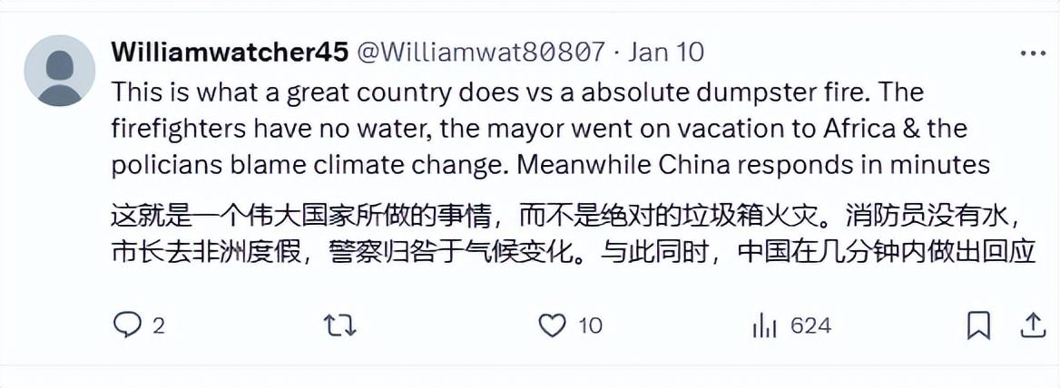 還有人說,這纔是一個偉大國家所做的事,而不是發生火災之後,消防栓沒有水,市長去非洲度假,警察歸咎於氣候變化,而與此同時,中國能在地震後幾分鐘內做出回應。