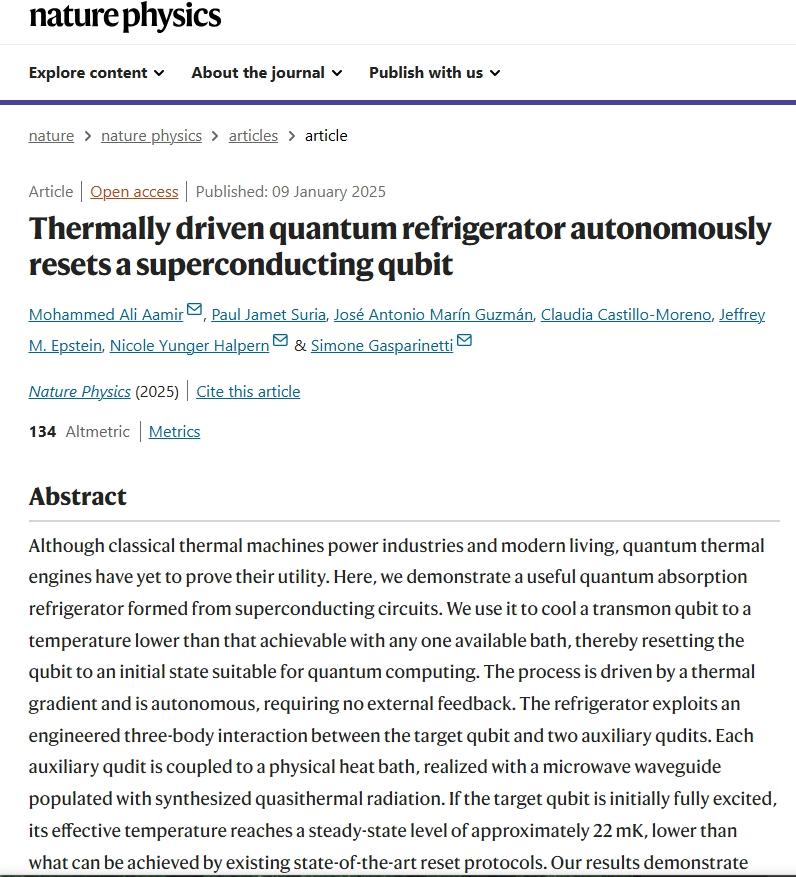 Aamir, M.A., Jamet Suria, P., Marín Guzmán, J.A. et al. Thermally driven quantum refrigerator autonomously resets a superconducting qubit. Nat. Phys. (2025). https://doi.org/10.1038/s41567-024-02708-5