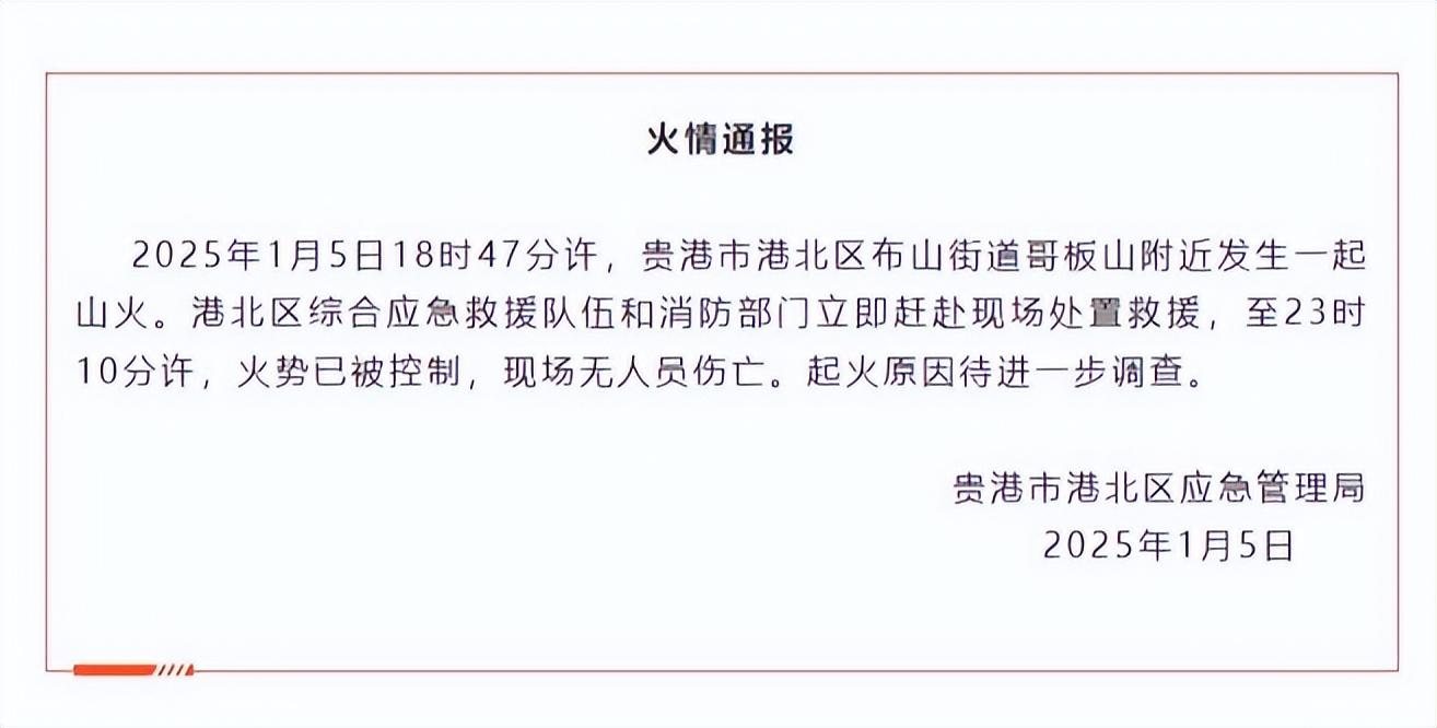 1月5日,廣西貴港發生山火,4.5個小時後,火勢得到控制,現場無人員傷亡。