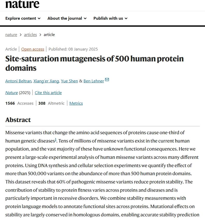 Beltran, A., Jiang, X., Shen, Y. et al. Site-saturation mutagenesis of 500 human protein domains. Nature (2025). https://doi.org/10.1038/s41586-024-08370-4