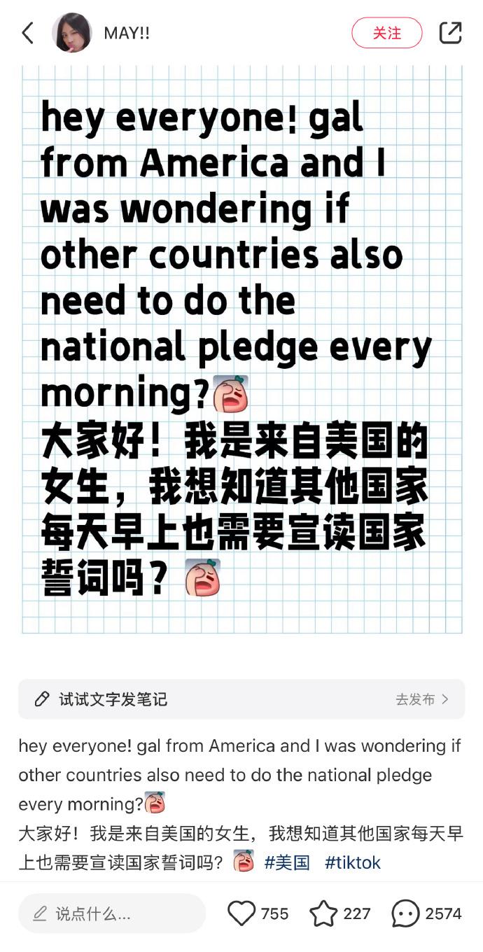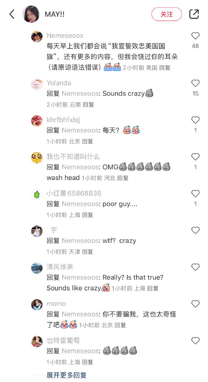 還有一個美國女孩問,我想知道其他國家每天早上也需要宣讀國家誓詞嗎?在美國人的印象裏,好像是中國人被自己的政府洗腦了,結果發現,中國人每天根本不宣讀國家誓詞,但是仍然熱愛自己的國家。這下我終於明白爲啥美國指責我們被洗腦了,合着他們每天就給自己的國民洗腦啊。