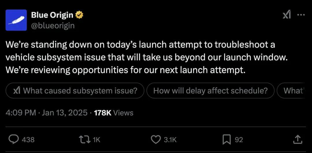 遺憾的是,這場異常高調的挑戰並沒有成功。此次“新格倫號”的發射窗口時長三小時,在這期間目標發射時間屢次推遲,最終發射任務被迫宣佈暫停。