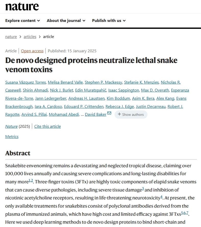 Vázquez Torres, S., Benard Valle, M., Mackessy, S.P. et al. De novo designed proteins neutralize lethal snake venom toxins. Nature (2025). https://doi.org/10.1038/s41586-024-08393-x