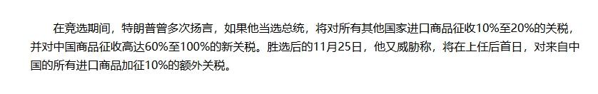 爲了避免國外商品的競爭,特朗普還計劃對所有進口到美國的商品都徵收10-20%的關稅,其中對中國商品徵收60%的關稅,對墨西哥進口的商品徵收25%~100%的關稅。