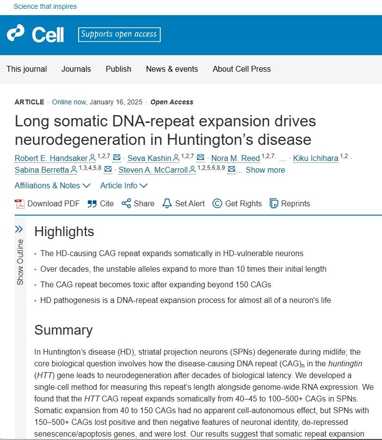 Handsaker, R. E., Kashin, S., Reed, N. M., Tan, S., Lee, W. S., McDonald, T. M., ... & McCarroll, S. A. (2025). Long somatic DNA-repeat expansion drives neurodegeneration in Huntington''s disease. Cell, 188, 1-17. https://doi.org/10.1016/j.cell.2024.11.038