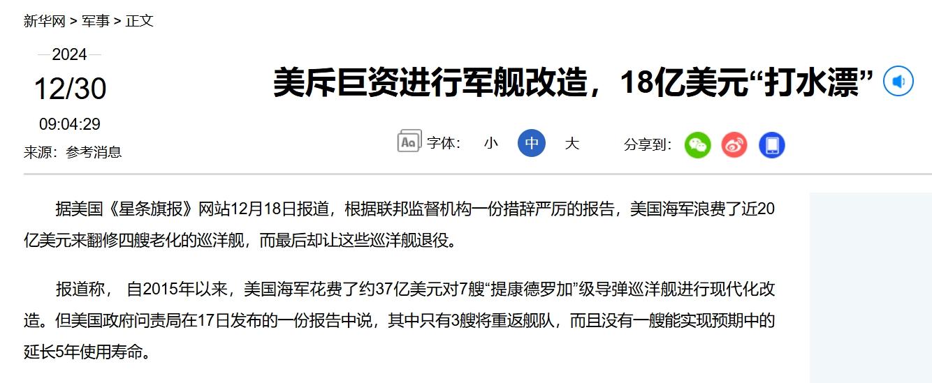 結果呢,美國調查發現,這7艘軍艦,只有3艘軍艦重返艦隊,但是吧,原先說現代化改造之後能延長服役5年,現在發現根本延長不了那麼久,最多隻能延長3年。這都還是好的,因爲另外4艘,也就是“順化市”號、“安齊奧”號、“維克斯堡”號和“考彭斯”號,這4艘一共花費了18.4億美元進行升級和維修,結果呢,再也沒有投入部署了,直接讓它們退役了。