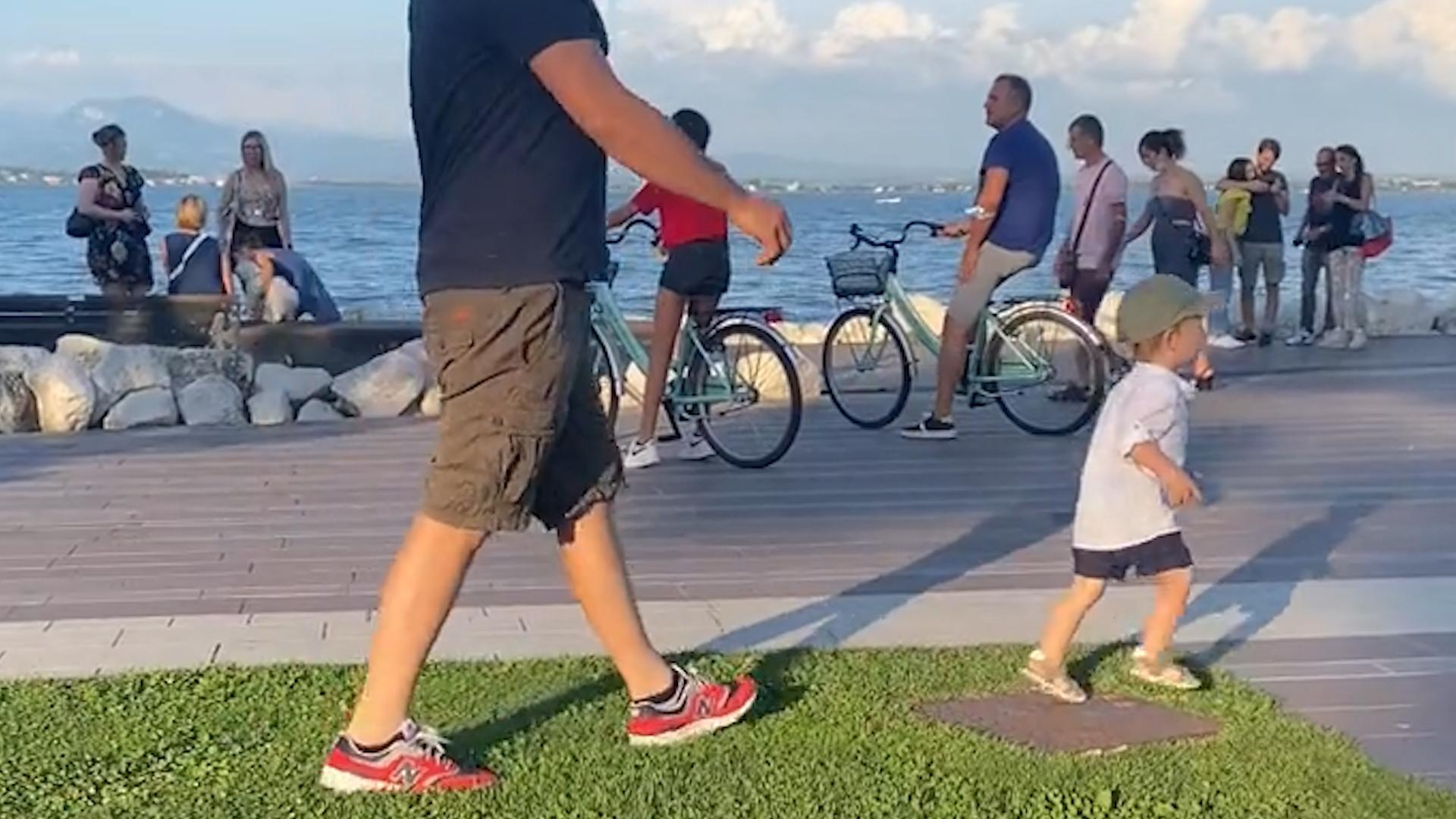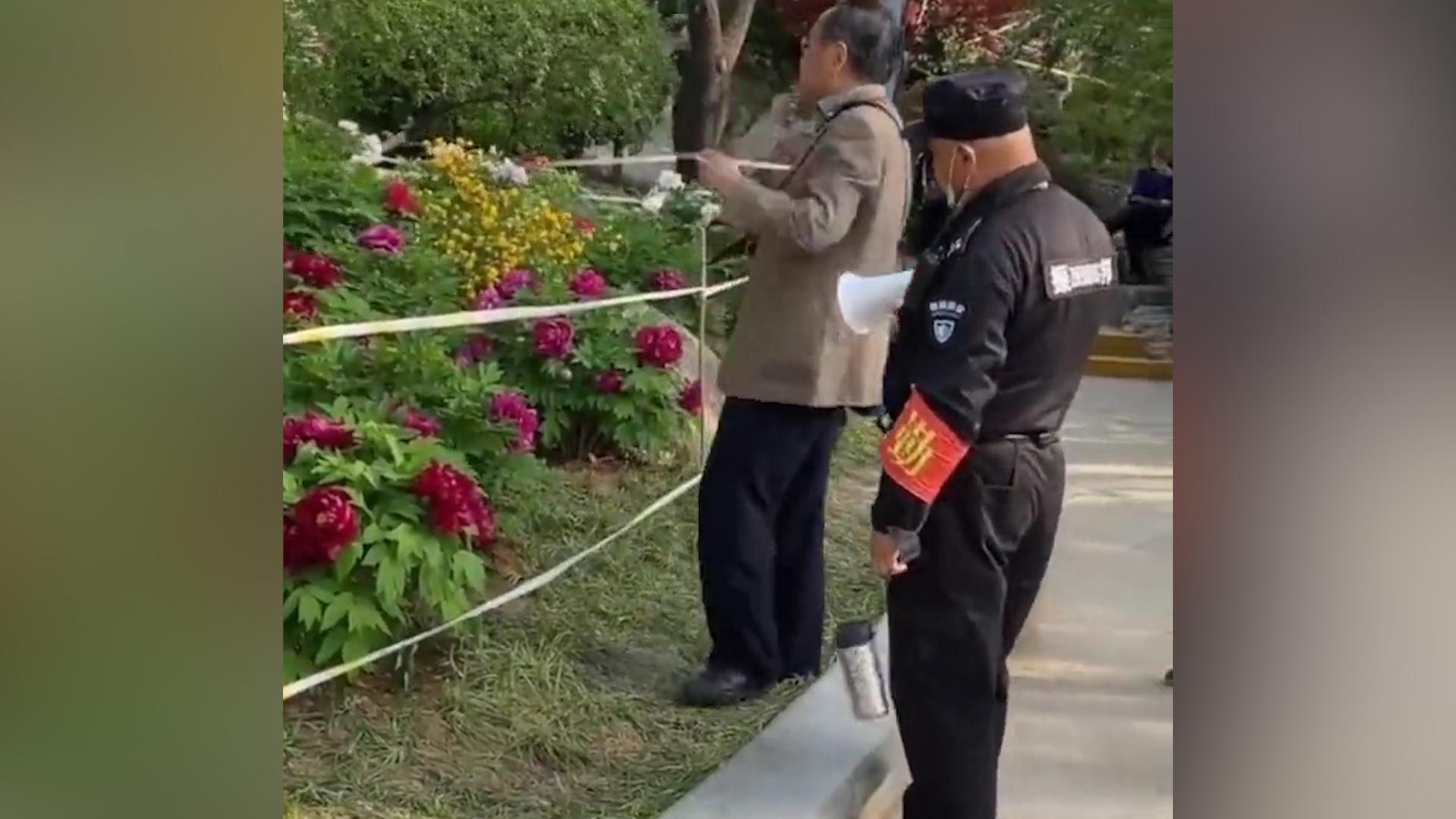國外草坪爲啥可以踩,中國的草坪就不行?一大爺踩草坪給花照相,保安沒法武力驅趕,只好拿出喇叭針對性喊!