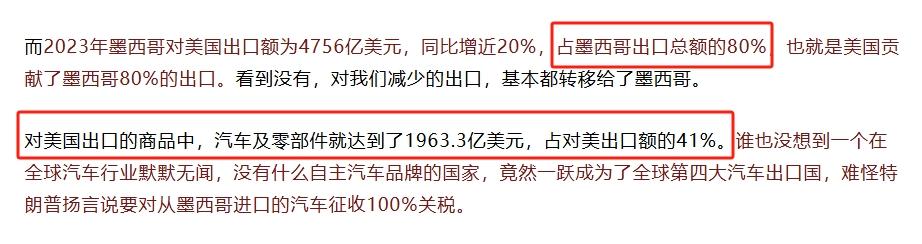 關鍵是墨西哥出口到美國的,絕大多數還都是汽車和汽車零部件,根據美國商務部數據顯示,2023年,美國從墨西哥進口商品總額達到了4750億美元,其中汽車和汽車零部件貢獻了1300.3億美元。