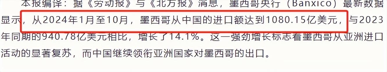 更加巧合的是,墨西哥出口美國屢創新高的同時,墨西哥從中國進口商品額也屢創新高,2024 年 1 月至 10 月,墨西哥從中國的進口額達到 1080.15 億美元,較2023年同期增長了14.1%。