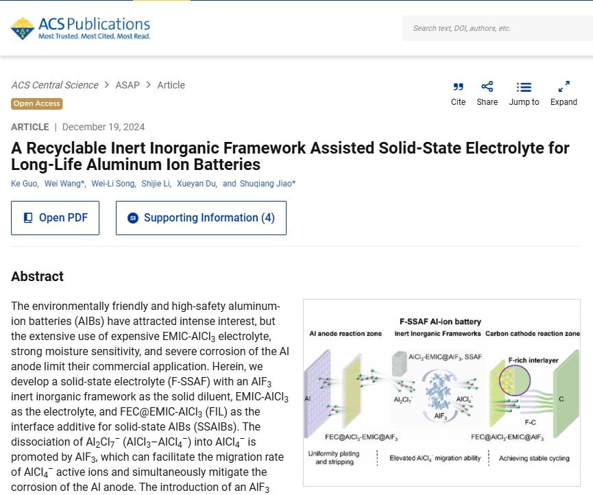 A Recyclable Inert Inorganic Framework Assisted Solid-State Electrolyte for Long-Life Aluminum Ion Batteries, Ke Guo, Wei Wang, Wei-Li Song, Shijie Li, Xueyan Du, and Shuqiang Jiao, ACS Central Science Article ASAP, DOI: 10.1021/acscentsci.4c01615