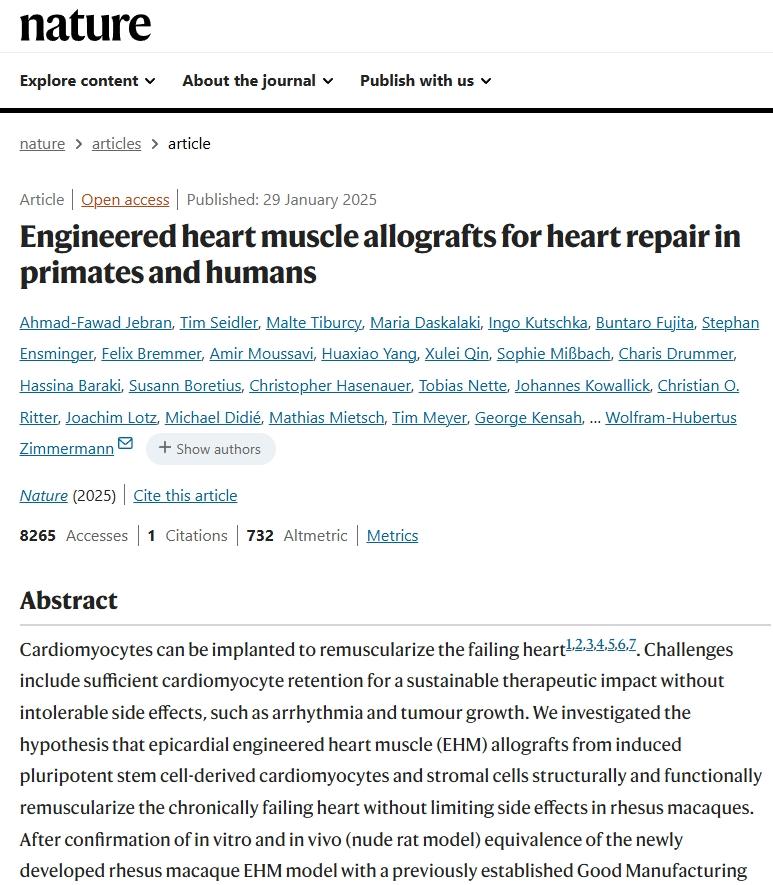 Jebran, AF., Seidler, T., Tiburcy, M. et al. Engineered heart muscle allografts for heart repair in primates and humans. Nature (2025). https://doi.org/10.1038/s41586-024-08463-0