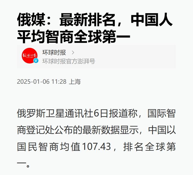 估計會有人說,中國人平均智商高,確實在一些調研統計當中,中國人平均智商名列前茅,比如:俄羅斯衛星通訊社報道,中國以國民智商均值107.43,排名全球第一;美國國民均值100.17,排名第二十七位。