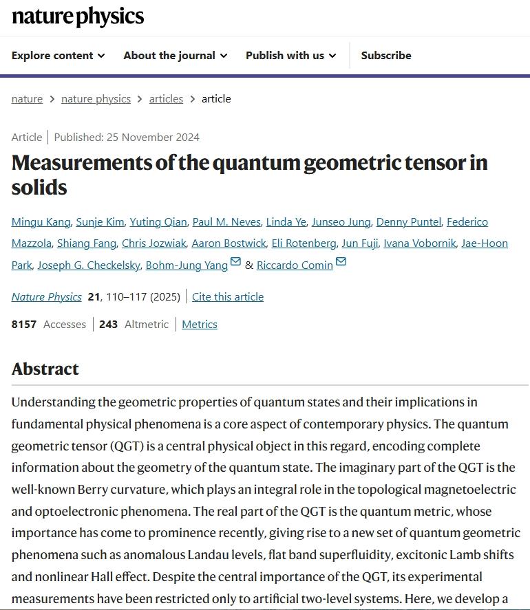 “Measurements of the quantum geometric tensor in solids” by Mingu Kang, Sunje Kim, Yuting Qian, Paul M. Neves, Linda Ye, Junseo Jung, Denny Puntel, Federico Mazzola, Shiang Fang, Chris Jozwiak, Aaron Bostwick, Eli Rotenberg, Jun Fuji, Ivana Vobornik, Jae-Hoon Park, Joseph G. Checkelsky, Bohm-Jung Yang and Riccardo Comin, 25 November 2024, Nature Physics. DOI: 10.1038/s41567-024-02678-8