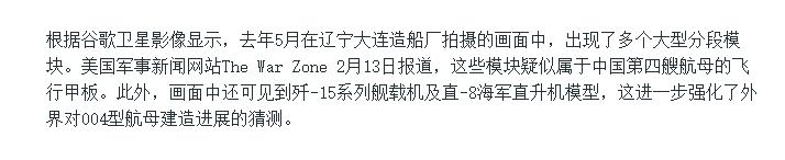 這個新聞是美國之音報道的,文章表示,根據谷歌衛星影像顯示,去年5月在遼寧大連造船廠拍攝的畫面中,出現了多個大型分段模塊。這些模塊疑似中國第四艘航母的飛行甲板。專家分析之後認爲,004航母可能是核動力航母。