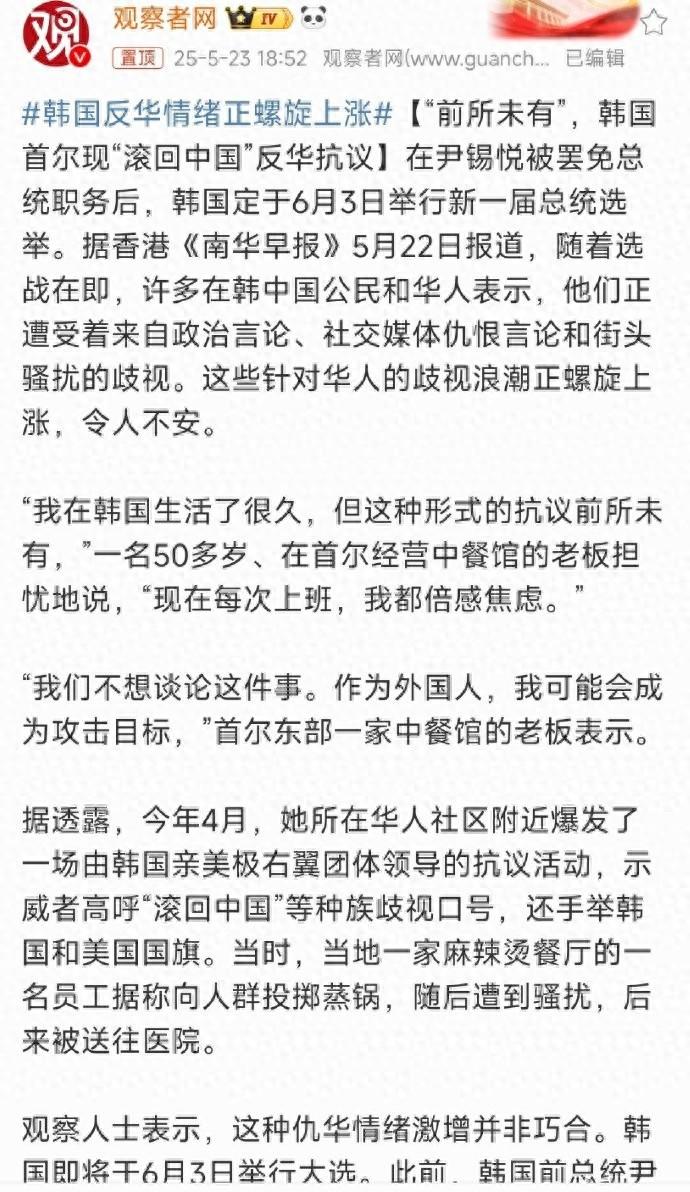 其實啊說白了,這次韓國的反華情緒,主要跟韓國大選有關。尹錫悅不是被彈劾了嗎,尹錫悅所在的國民力量黨,以及其他的親美極右翼團體爲了在大選前凝聚人心,開始炒作“中國間諜滲透”“中國干預選舉”的陰謀論。