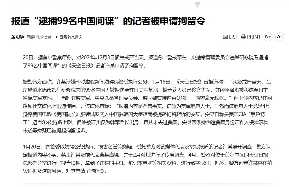 韓國部分媒體也配合極右翼團體編造虛假媒體,《天空日報》曾抹黑說,尹錫悅緊急戒嚴當天,在京畿道水原市選舉研修院內的99名中國人被押送至駐日美軍基地,被查獲人員已移交美軍,並經平澤港被移送至日本沖繩美軍基地。