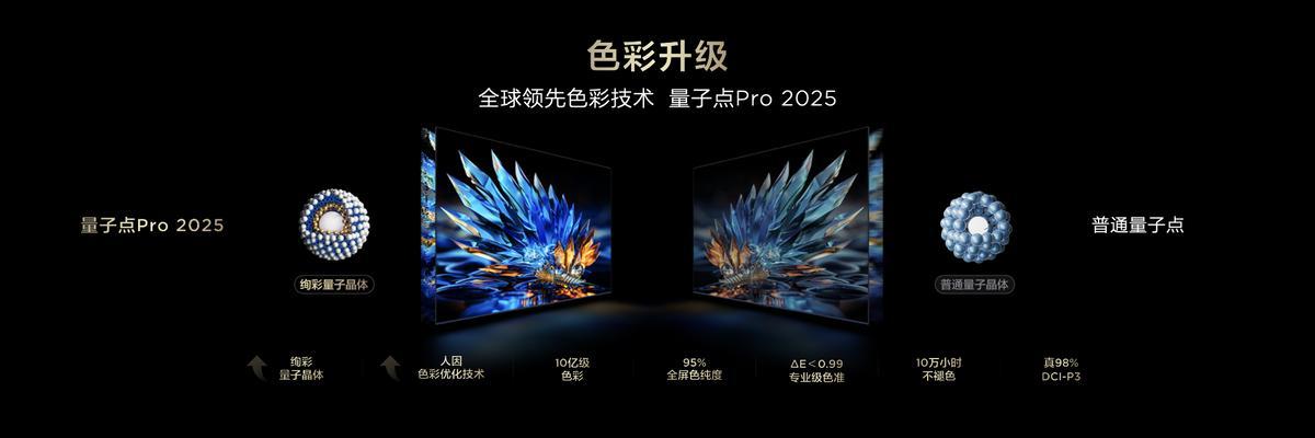 在亮度表現上,TCL T7L Pro 系列將 XDR 1600nits 升級爲絢彩 XDR 2200nits,峯值亮度持續時間數倍延長,結合量子點 Pro 2025 技術,真正做到十億原色屏,十年好色彩。量子點 Pro 2025 技術實現了從量子點材料到色彩算法的全面升維,實現真・98% DCI-P3 超高色域,色準 ΔE<0.99,全屏色純度達 95%,色彩持久不褪色。