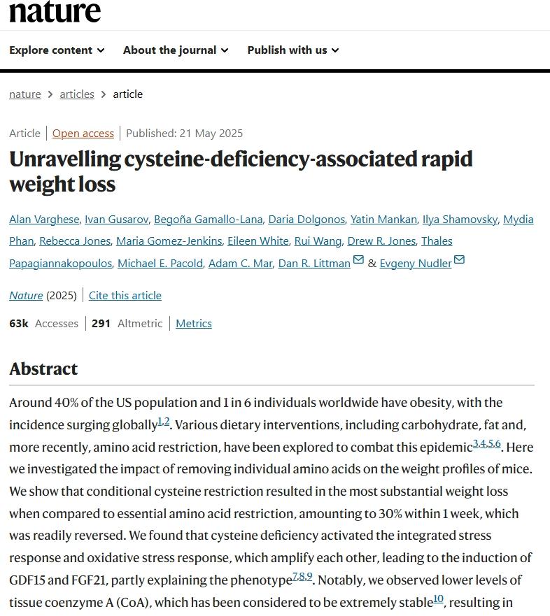 這項研究5月21日發表在《自然》雜誌上,通過一個看似簡單的氨基酸缺乏實驗,揭示了代謝調節的驚人奧祕。雖然離直接應用還有距離,但它爲我們打開了理解和調控體重的新大門。