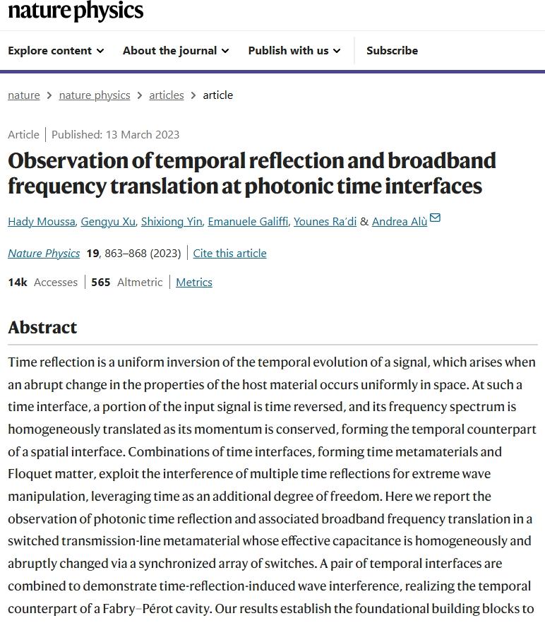 Nature Physics, "Observation of temporal reflection and broadband frequency translation at photonic time interfaces" (2023)