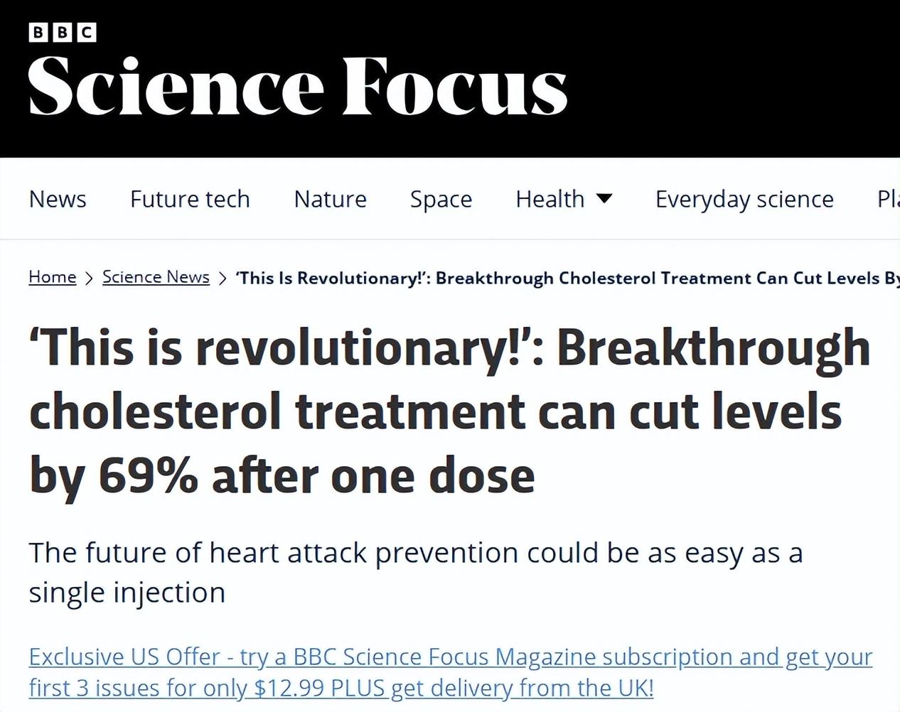 - BBC Science Focus Magazine. "Breakthrough cholesterol treatment can cut levels by 69% after one dose." May 22, 2025.