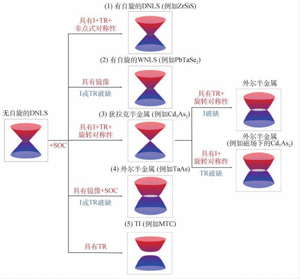 在衆多的拓撲材料中,拓撲半金屬(Topological semimetal)是一類兼具金屬和絕緣體特性的材料,其電子能帶結構中存在特殊的交叉點,稱爲拓撲節點。這些節點承載着狄拉克費米子或外爾費米子等準粒子。需要注意的是,這些“費米子”並非真實的基本粒子,而是電子與晶格相互作用產生的集體激發行爲,類似於半導體物理中的“空穴”概念。