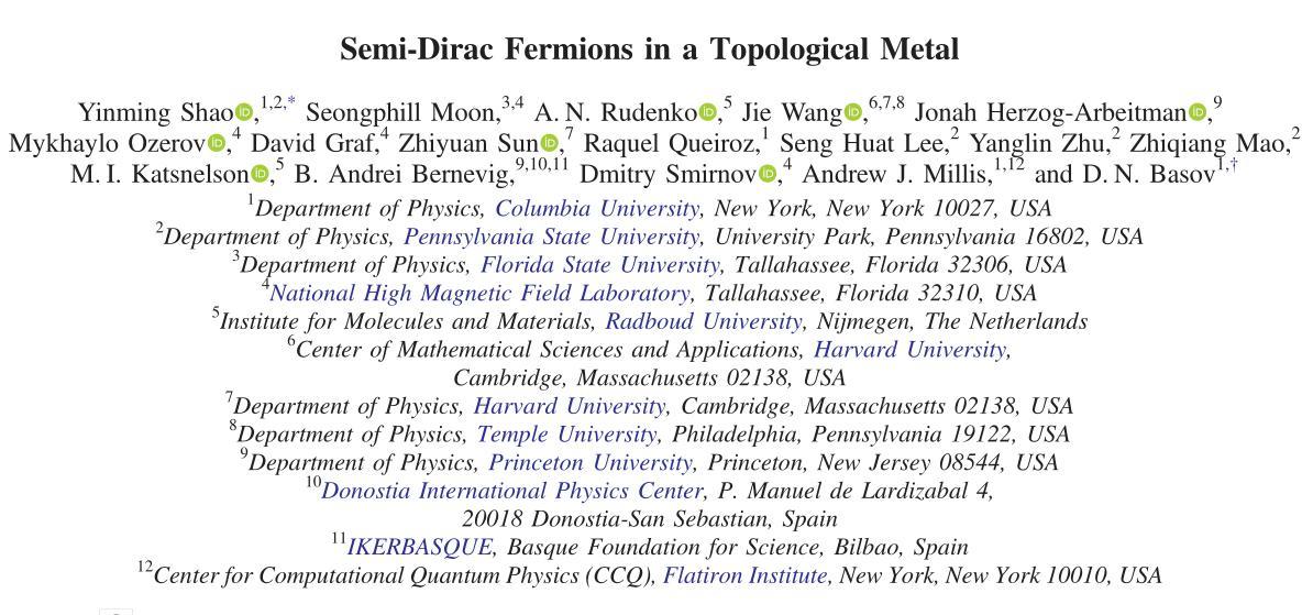 - Shao Y., Moon S., Rudenko A. N., et al. Semi-Dirac fermions in a topological metal[J]. Physical Review X, 2024, 14(4): 041057.
