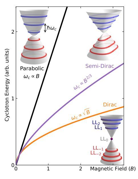常規費米子(黑線)、狄拉克費米子(橙線)和半狄拉克費米子(紫線)的迴旋能量與磁場的關係