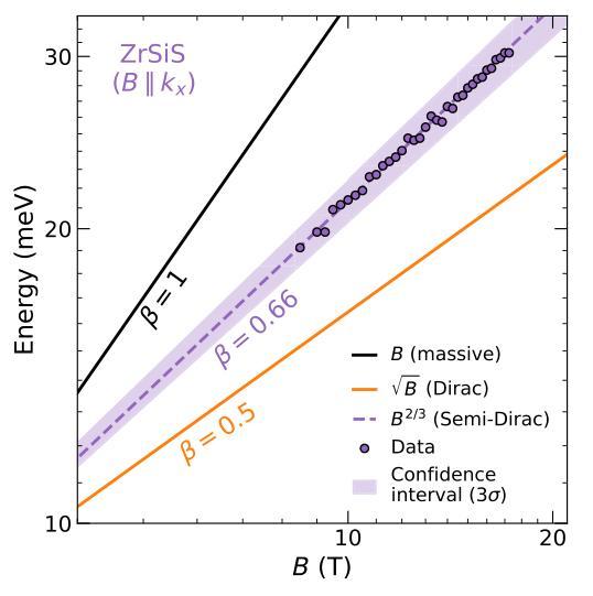 儘管理論上普遍認爲半狄拉克費米子存在於應變石墨烯中,但由於實驗中難以實現所需的應變,直接觀測這些費米子一直頗具挑戰性。然而,隨着拓撲材料研究的深入,科學家在實驗上發現了不同費米子的迴旋能量與磁場強度B之間存在不同的冪律依賴關係,即朗道能級躍遷冪律,這一現象如下圖所示。