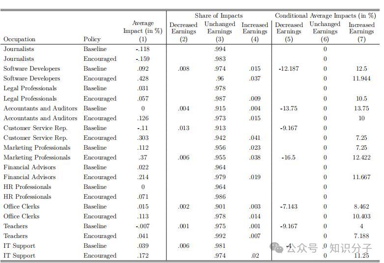 圖2 此表第1列爲使用AI的員工平均感知收益影響(以百分比表示),報告收入減少的員工(第2和5列)、收入不變的員工(第3和6列)以及收入增加的員工(第4和7列)。