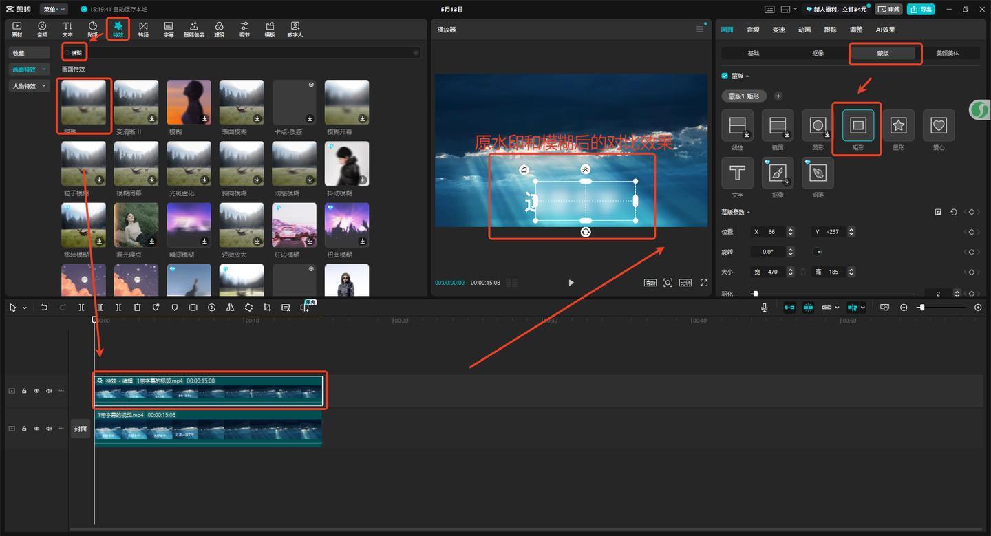 將視頻導入剪映,複製一個視頻放置在原視頻上方,將【特效】中的【模糊】效果添加到複製的視頻中,點擊視頻中的特效模糊,可以更改模糊度。在【蒙版】中添加一個矩形蒙版,將蒙版放在水印處,調整參數即可,下圖能夠看到去水印前後的對比變化。