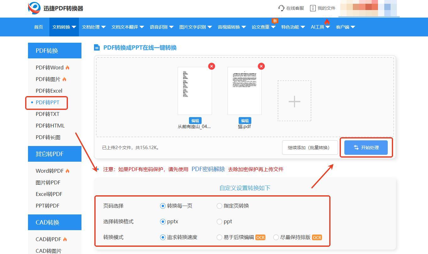 它的同源網站也很好用,功能非常多,而且無需下載,在線就能將PDF轉換成PPT,適合臨時需要轉換PDF格式的朋友使用。選擇【文檔轉換】中的【PDF轉PPT】,導入PDF後設置轉換參數,接着點擊【開始轉換】後就能得到轉換成功的PPT文件了。