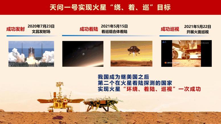 2020年7月23日,天問一號探測器在文昌航天發射場由長征五號遙四運載火箭發射升空,着巡組合體於2021年5月15日成功軟着陸火星表面,並在7天后開展了火面巡視。天問一號順利實現了對火星進行“繞、着、巡”的三大任務,使我國成爲繼美國之後,第二個在火星着陸探測的國家。