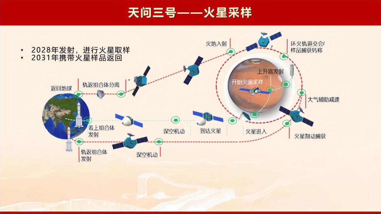 2030年前後,我國將實施天問三號任務,確立生命痕跡探尋爲第一科學目標,開展火星着陸、火面起飛、火星軌道交會,實現火星採樣返回。屆時,我國有望成爲第一個火星採樣返回的國家。此外,我國也已經開始籌劃建設世界首個火星樣品試驗室。