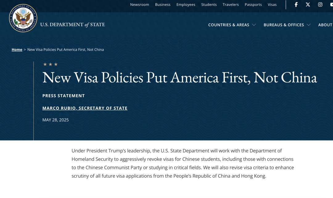 5月28日,一條突發消息震驚了美國的華人圈。美國國務卿在網站上發表題爲《新簽證政策優先考慮美國,而非中國》新聞聲明,用詞極其強硬:“在特朗普總統的領導下,美國國務院將與國土安全部合作,大力撤銷(aggresively revoke)中國學生的簽證,包括在關鍵領域學習的學生或是與中國共產黨有聯繫的學生。我們還將修改簽證標準,加強對中國大陸和香港未來所有簽證申請的審查。”