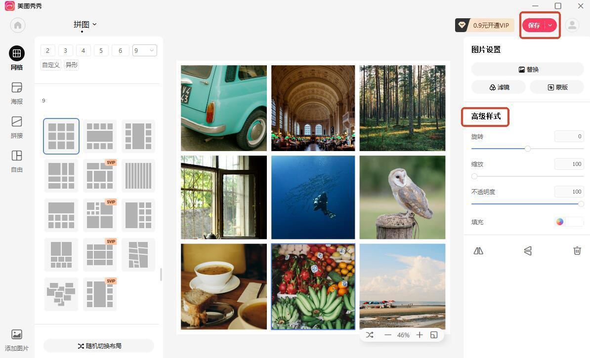 在【宮格拼圖】中,一次可以上傳1-30張圖片,導入圖片後軟件會自動將上傳的圖片拼圖,不過不同張數都有不一樣的拼圖模板,還可以自己任意選擇模板,還能移動圖片的位置、設置背景等。