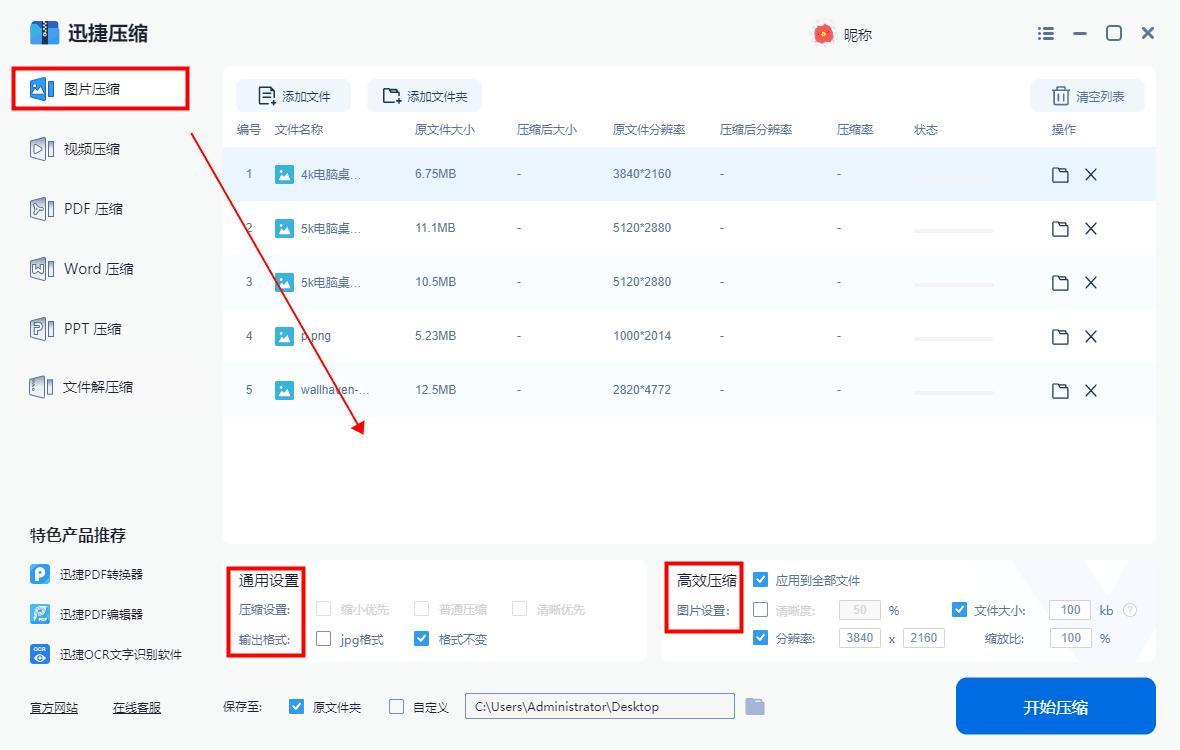 軟件支持多種壓縮方式,包括縮小優先、普通壓縮、清晰優先以及指定文件大小,在這裏可以找到合適的壓縮方式。