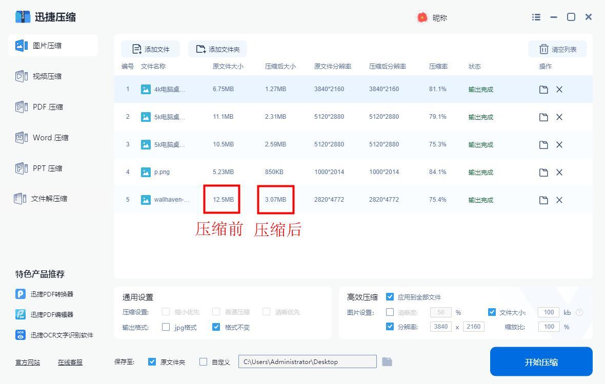 最後點擊右下角的【開始壓縮】,即可將圖片壓縮至指定的體積,界面會顯示壓縮前後的體積對比,壓縮後的圖片畫質依舊清晰。