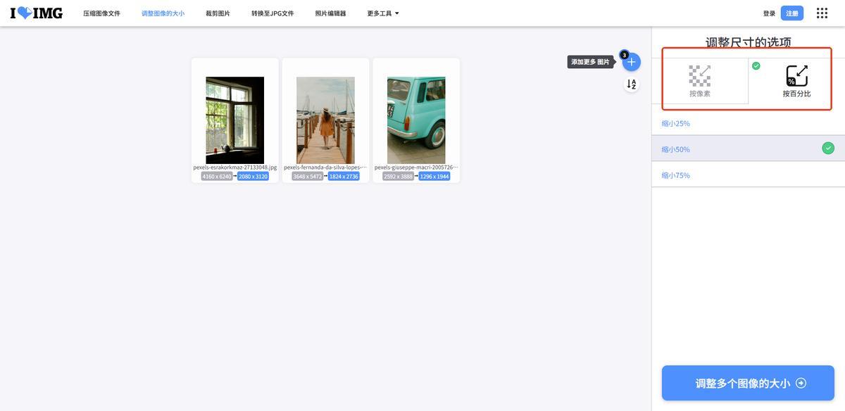一個提供一站式圖片處理服務的網站,支持圖片壓縮、裁剪、旋轉及格式轉換,支持批量壓縮多張圖片,網站支持按照百分比和按照像素的方式壓縮圖片,設置好壓縮比例之後即可在線壓縮圖片。