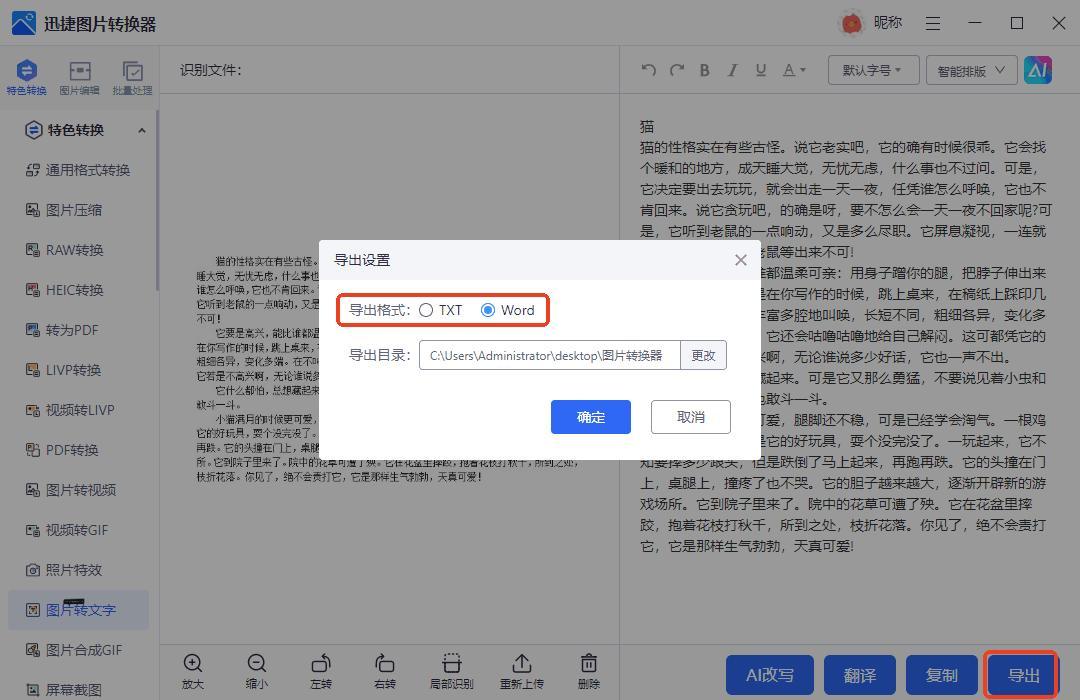 稍等一會即可得到識別後的文字,識別的文字很準確,基本沒有錯誤,可以翻譯、複製、AI改寫,以及將文字導出爲TXT和Word格式。