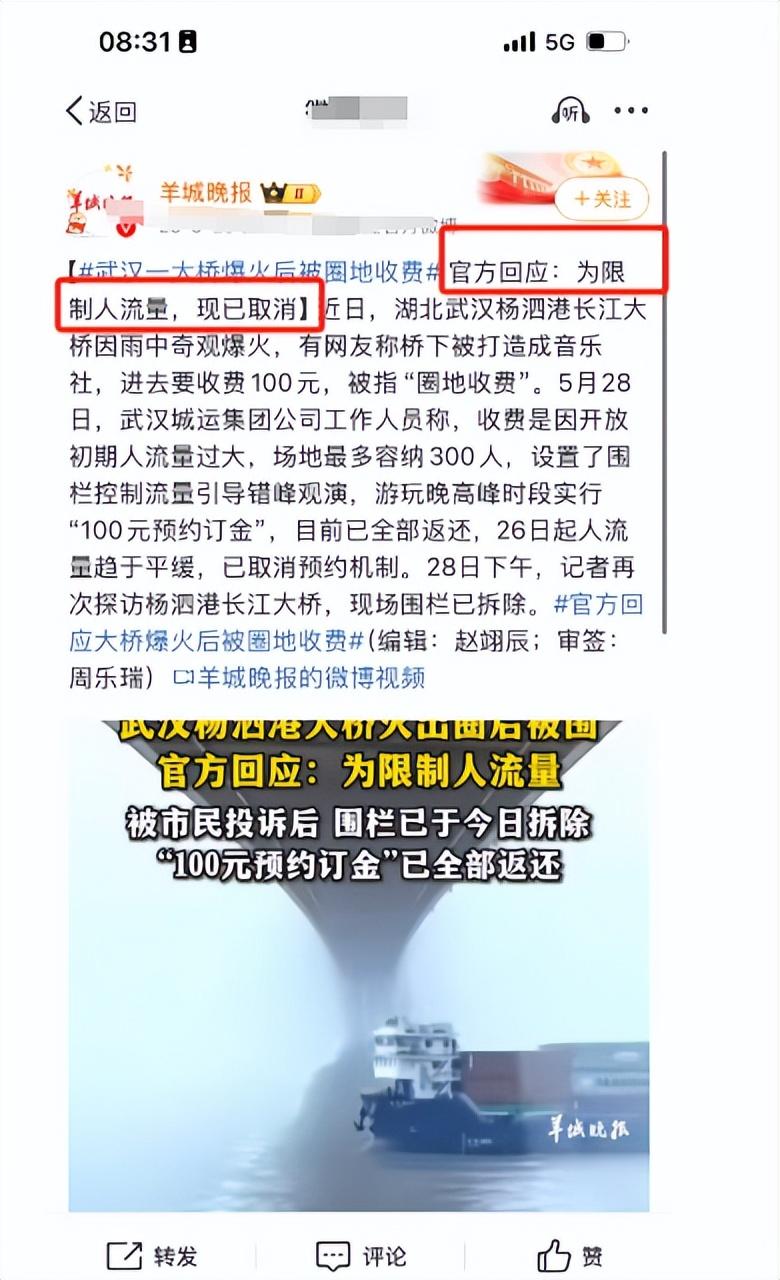 想出片先交押金100,眼見激起民怨,當地回應參觀結束後會退還!悄悄試探,隨着輿論失控立馬換副嘴臉!按理說楊泗港大橋獲得那麼大曝光量,稍微用心打造下可以成爲武漢名片!我偏要背道而馳!本地人火上澆油調侃!本來對武漢就無感現在徹底死心了,我還是去別的城市玩,好在圈地現狀沒維持一週,相關部門還是聽進去了一點意見,目前違建已被拆!