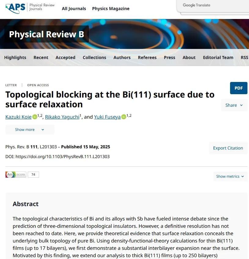- Koie, K., Yaguchi, R. & Fuseya, Y. Topological blocking at the Bi(111) surface due to surface relaxation. Physical Review B111, L201303 (2025).