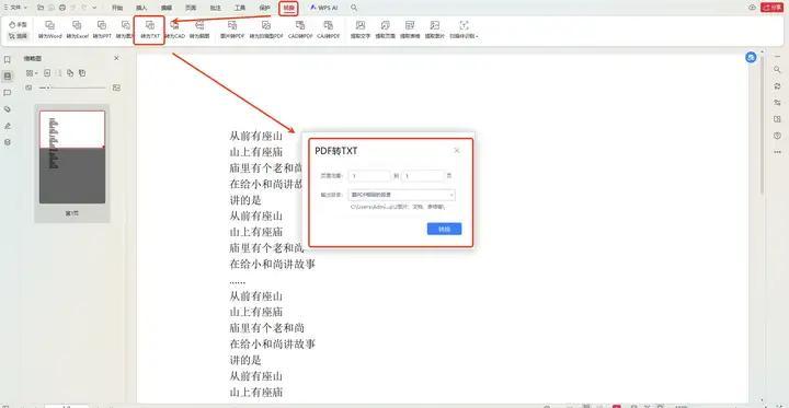 一款有很多實用功能的軟件,不僅支持PDF閱讀和編輯,還能輕鬆的將PDF轉爲TXT格式,操作也不難,使用WPS打開PDF文檔,選擇【轉換】中的【轉爲TXT】,在轉換界面中設置輸出目錄和頁面範圍,然後點擊【轉換】即可。