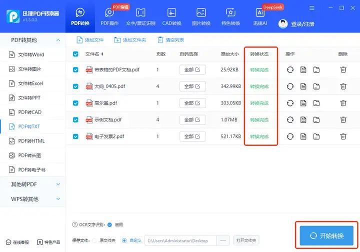 最後點擊【開始轉換】就能將PDF轉換成TXT文檔,轉換狀態更換成綠色的“轉換完成”即可在指定文件夾中找到TXT文檔。