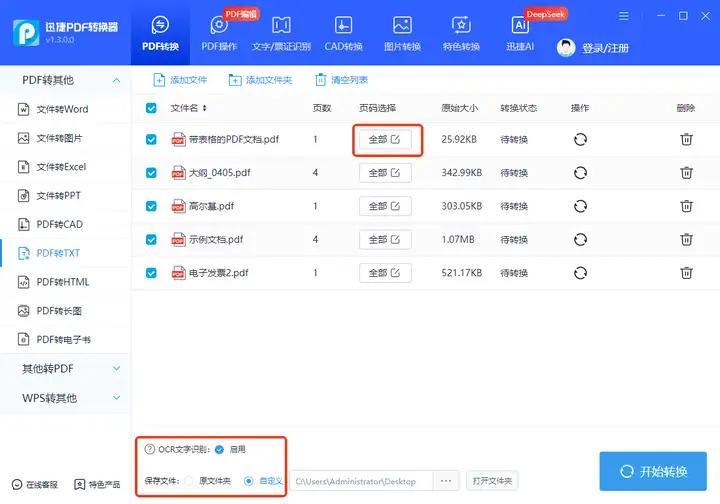 設置是否使用OCR文字識別、需要轉換的文檔頁碼以及輸出位置,使用OCR可以讓轉換後的TXT文檔質量更高。