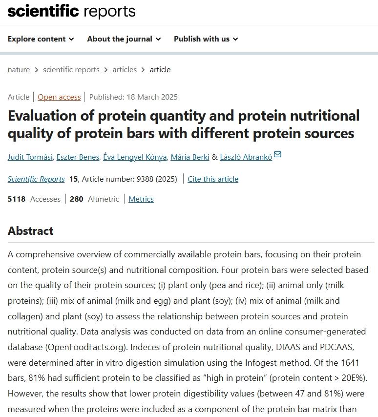 參考文獻: Tormási, J., Benes, E., Lengyel Kónya, É., Berki, M., & Abrankó, L. (2025). Evaluation of protein quantity and protein nutritional quality of protein bars with different protein sources. Scientific Reports, 15, 9388.