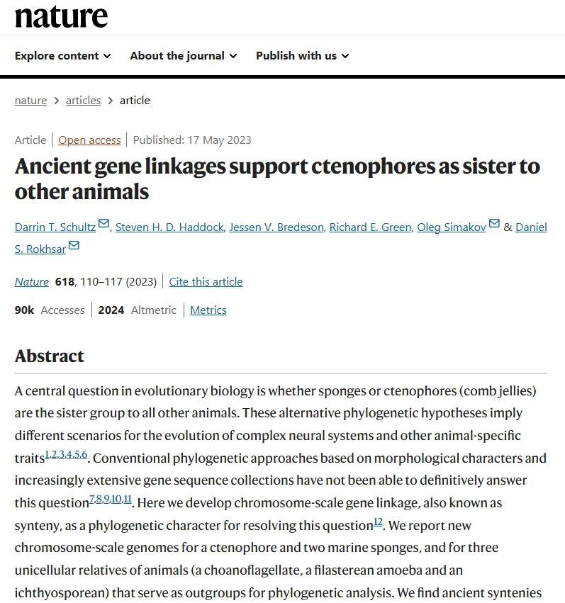 Schultz, D.T., Haddock, S.H.D., Bredeson, J.V. et al. Ancient gene linkages support ctenophores as sister to other animals. Nature 618, 110–117 (2023). https://doi.org/10.1038/s41586-023-05936-6