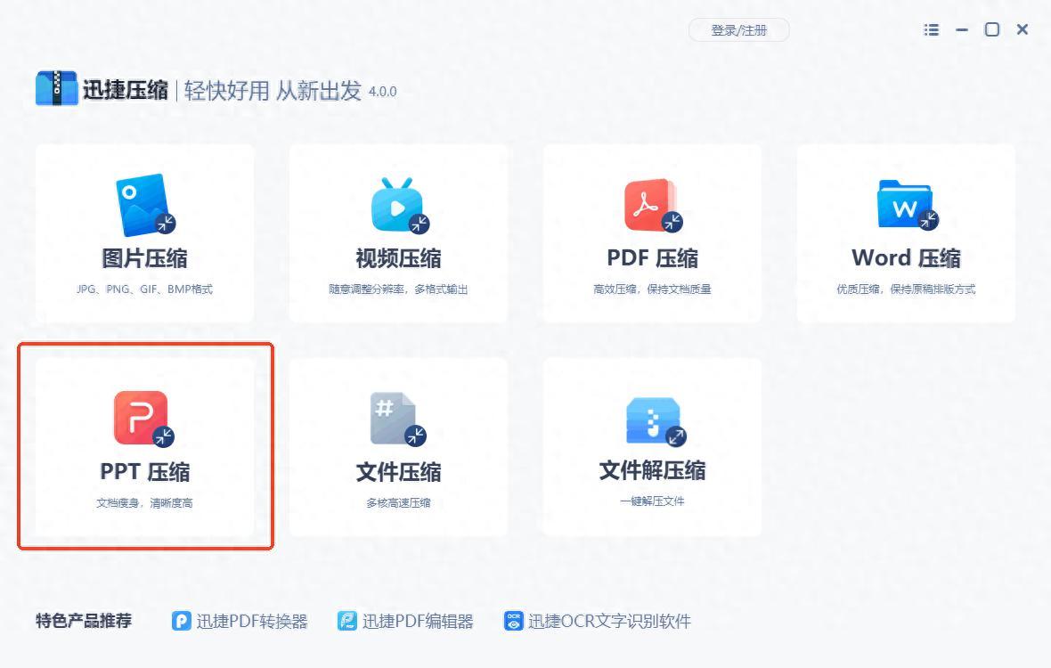 打開軟件,選擇首頁的【PPT壓縮】,添加多個需要壓縮的PPT文件。