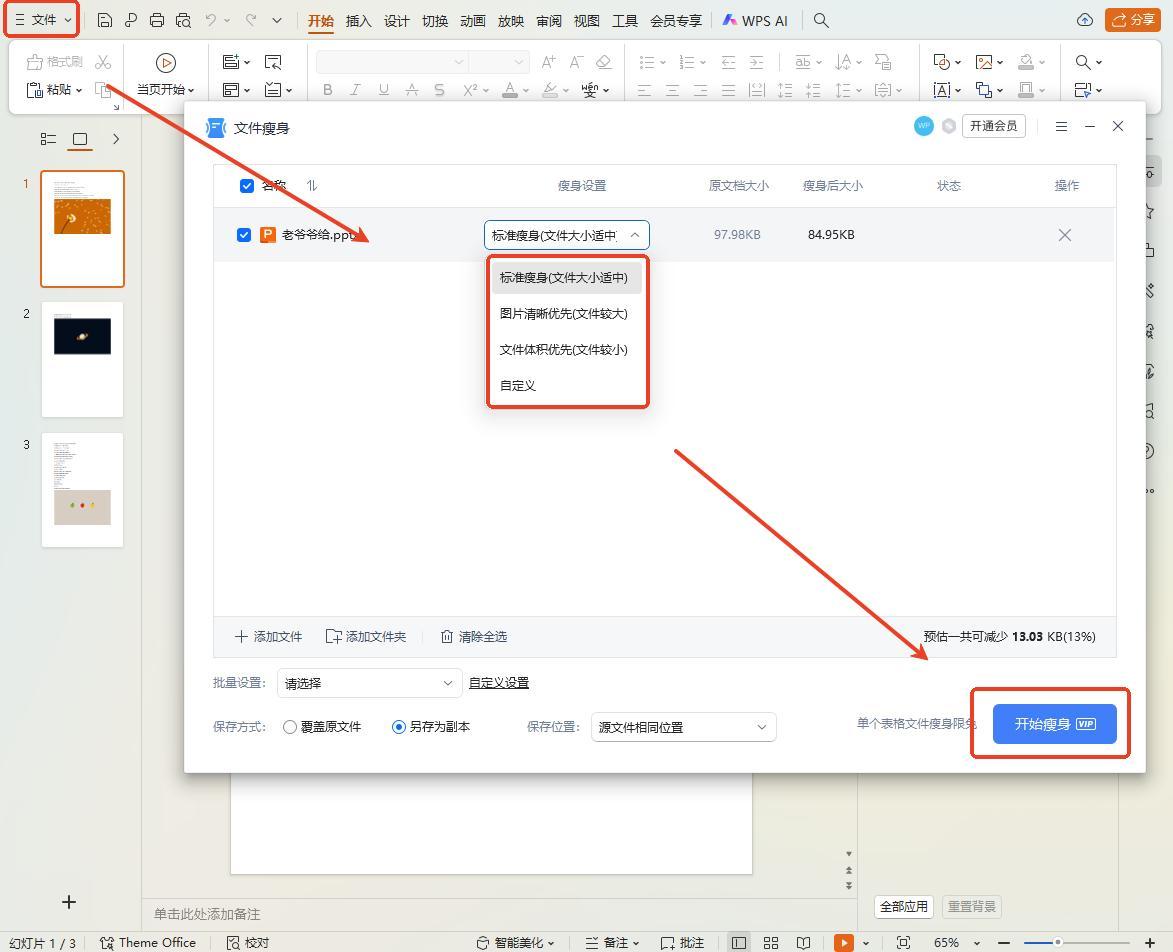 WPS作爲一個可以創建和編輯PPT文檔的軟件,也可以將PPT文件變小,操作也不難。使用WPS打開PPT,點擊左上角的【文件】,找到【文件瘦身】,接着在瘦身設置中選擇需要的參數,包括標準瘦身、圖片清晰優先、文件體積優先以及自定義,選擇之後點擊右下角的【開始瘦身】即可,需要會員才能使用。