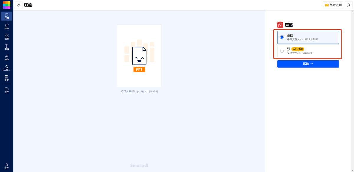 一款在線文件處理工具,支持PDF壓縮、PDF轉換、PDF合併等功能,其實它也可以添加PPT文檔進行壓縮體積,網站能夠分析PPT文件中的元素,優化圖片和多媒體內容,從而減小文件體積。